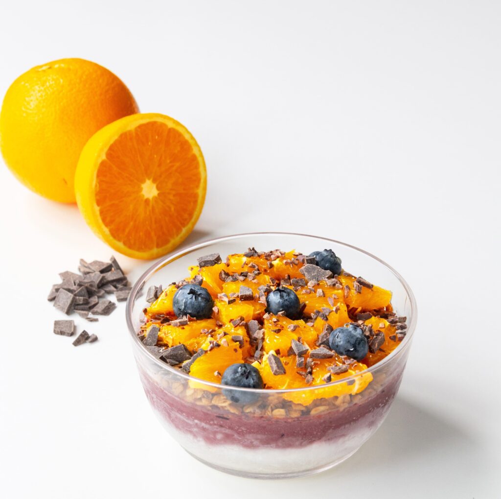 ベリーの余韻が広がるアサイースムージーと、スパイスが効いたカカオスムージーの2層仕立て。グラノーラ、ブルーベリー、オレンジ、カカオニブ、チョコレ―トを合わせ、みずみずしいオレンジと芳醇なカカオが引き立つ、食後まで楽しい1杯です。