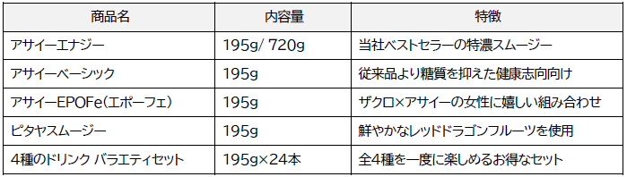 人気・ロングセラー商品である「アサイーピューレ」、「お家でアサイーボウル7パック」に加え、待望のドリンク商品が新たにラインナップ。多くの方からご要望いただいていた特濃アサイースムージー「アサイーエナジー」などの人気ドリンクが、お求めやすい数量(カート缶 195g 6本〜、大容量 720g 3本〜)でお買い求めいただけるようになりました。
